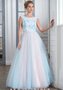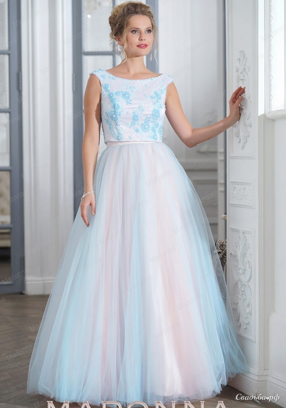 Шикарное розово-голубое платье легко может стать идеальным нарядом невесты, однако, и в качестве вечернего туалета выглядит просто потрясающе. Пышная юбка в сочетании с роскошно декорированным лифом выглядит эффектно и элегантно, а добавив к образу изящную диадему, вы почувствуете себя настоящей принцессой!