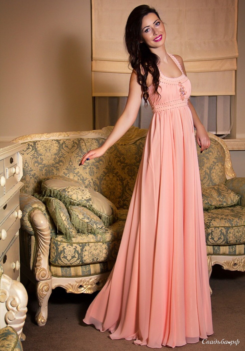 Коралловое платье нежного цвета из шифона расшито вручную!