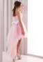 Вечернее платье, идеальное для выпускного вечера. Платье короткое с удлинением юбки сзади в шлейф. Корсет затянут гипюром, форма лифа - сердечко. Платье украшено тонким пояском и бантом сзади. Данная модель шикарно подчеркивает стройные ножки.