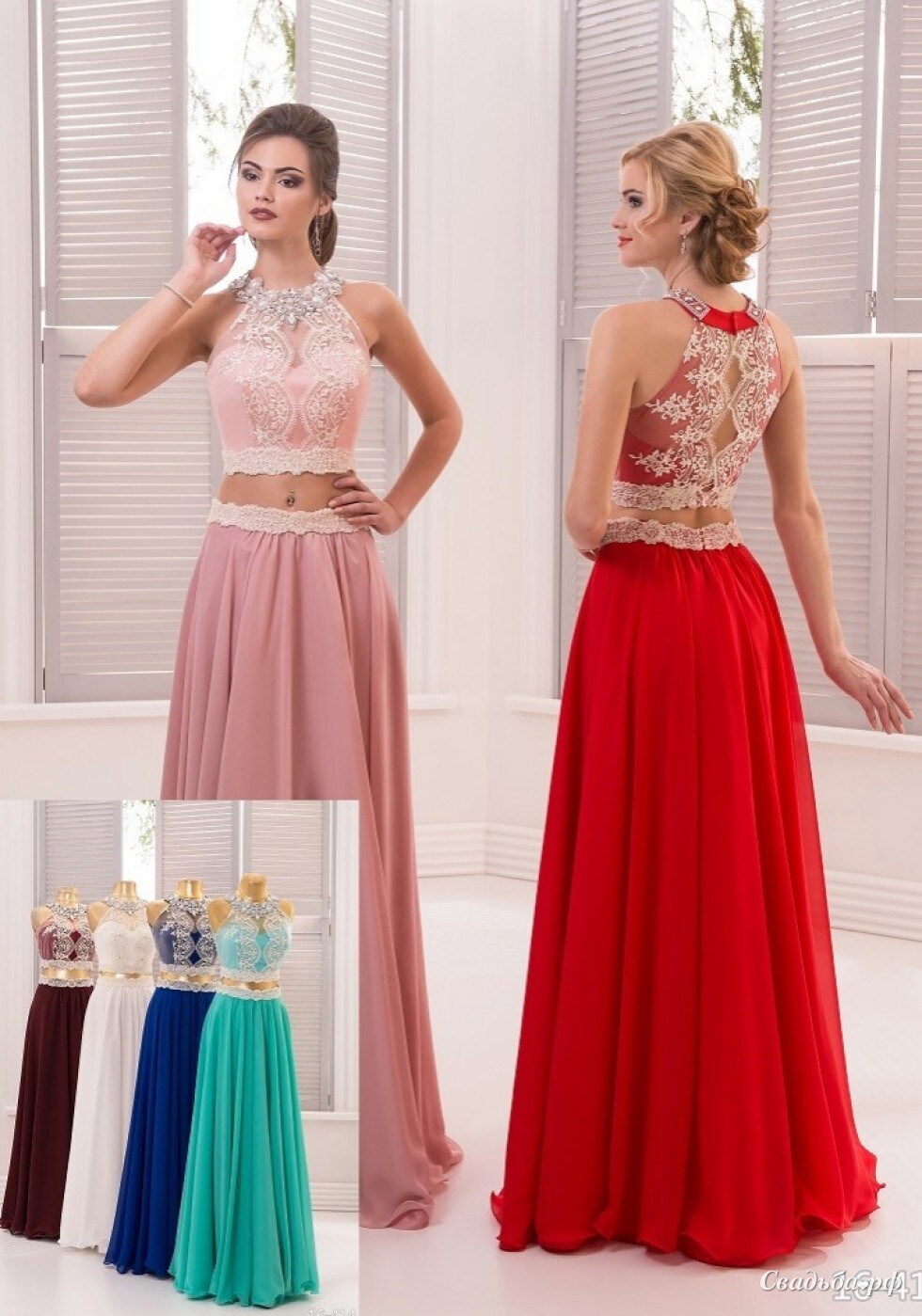 Вечернее платье с кружевом и массивным украшением (топ и юбка).