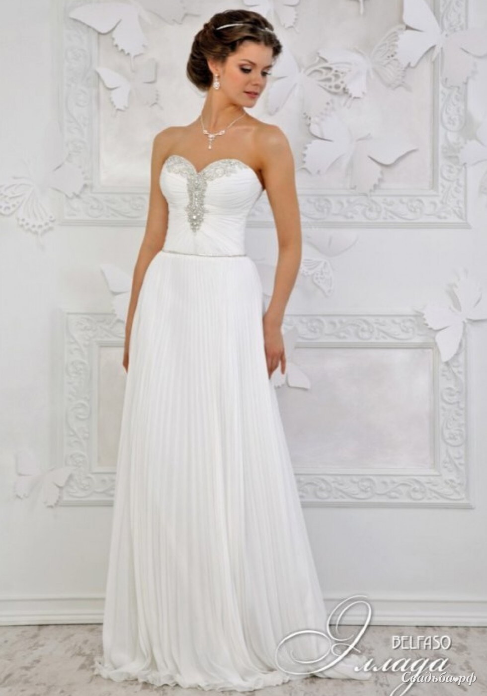 Очаровательное прямое греческое платье с драпированным корсетом, украшенным вручную камнями, линию талии подчеркивает тонкий поясок. Подол легкий непышный, с небольшим шлейфом.