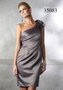 Оригинальное короткое платье с драпированным лифом на одно плечо, спина так же ассиметрично открыта. Украшают платье крупные цветы из ткани и волан по спинке.