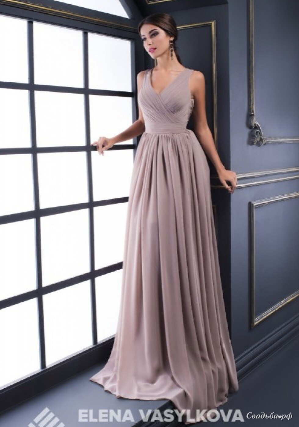 Оригинальное и в то же время изысканное длинное платье в пол. Лиф с тугой драпировкой на широких лямочках, спинка с V-образным вырезом, линия талии подчеркнута пояском из основного материала, подол юбки летящий из шифона.