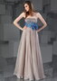 Очень интересное вечернее платье. Вертикальная драпировка формирует открытый прямой лиф. На линии талии расположена вышитая цветочная композиция из бисера и бусин и большой бант. Длинная широкая юбка ниспадает на пол мягкими складками. Модель прекрасно подойдёт как худеньким дамам, так и девушкам с пышными формами.