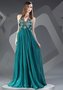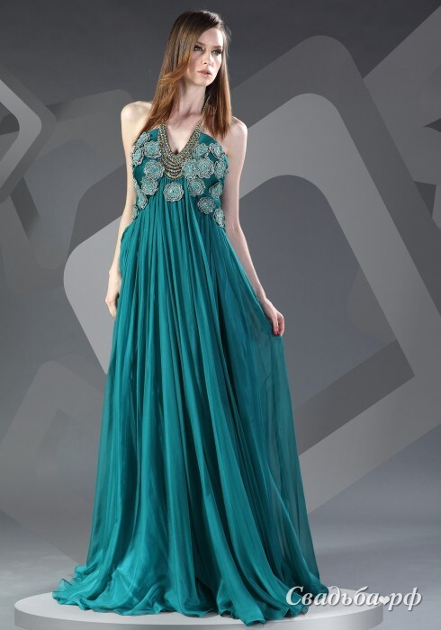 Эффектное вечернее платье с глубоким V-образным вырезом. По контуру лифа расположена рельефная вышивка, которая чем-то напоминает ряд бус ручной работы. Лиф платья также расшит кружевными цветочными элементами с бисером и бусинами. Модель прекрасно подойдёт как худеньким дамам, так и девушкам с пышными формами.