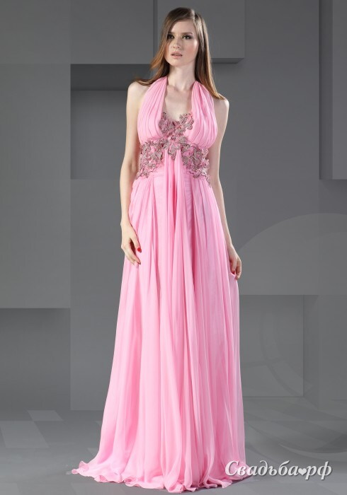Очень нежное вечернее платье из лёгкой струящейся ткани. Широкие полосы драпировки формируют лиф модели и бретели. Неглубокий круглый вырез, а также корсет платья расшиты рельефными цветочными узорами. Юбка длинная, широкая, невесомая. Модель подойдёт как худеньким дамам, так и девушкам с пышными формами.