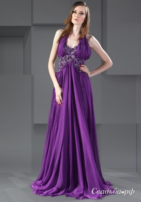 Изысканное вечернее платье насыщенного глубокого цвета. Лиф платья и широкая длинная юбка выполнены из лёгкой струящейся ткани. Круглый вырез оформлен рельефной вышивкой. Такие же вышитые элементы расположены на линии талии. Модель прекрасно подойдёт как худеньким дамам, так и девушкам с пышными формами.