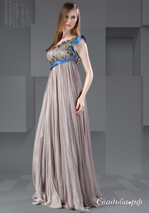 Очень эффектное вечернее платье с длинной широкой юбкой. Лиф модели полностью расшит декоративными розочками, украшен бисером и бусинами, а также тесьмой со стразами. По краю единственной бретели и по линии талии проходит лента контрастного цвета. Модель подойдёт как худеньким дамам, так и девушкам с пышными формами.