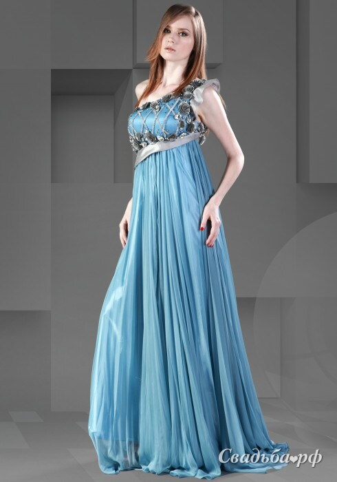 Изысканное вечернее платье, по стилю похожее на королевский наряд. Открытый косой лиф расшит стразами и бисером. По краям лифа расположились небольшие цветы из ткани. Пояс в тон цветам и стразам. Широкая длинная юбка струится вдоль фигуры. Такая модель прекрасно подойдёт как худеньким дамам, так и девушкам с пышными формами.