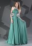 Эффектное вечернее платье с очень длинной и широкой юбкой. Ворот платья выполнен из плотной широкой тесьмы, украшенной камнями. Из такой же тесьмы сформирован большой бант на линии талии. Лиф модели задрапирован более лёгкой тканью. Центральная часть лифа похожа на длинный шарф. Она свисает вдоль всего платья, слегка закрывает бант и растворяется в складках юбки.
