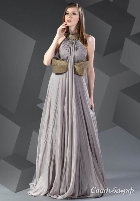 Изысканное вечернее платье для подруги невесты, для королевы выпускного бала или любого другого торжественного события. Огромный бант расположился по центру модели. Его слегка прикрывает длинный шарф, берущий своё начало у ворота, расшитого декоративными камнями. Лёгкая драпировка украшает лиф платья и свободными мягкими волнами окутывает всю фигуру.