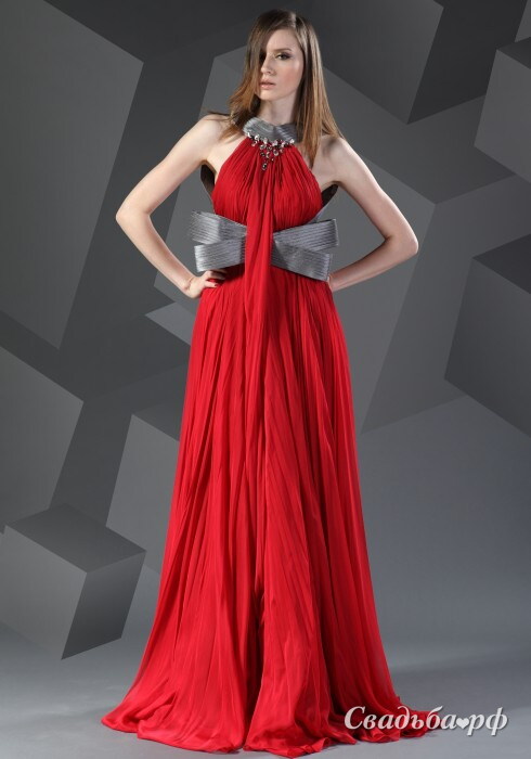 Роскошное вечернее платье, построенное на контрасте цвета и фактуры. Круглый ворот, большой бант по центру и пояс модели выполнены из более плотной ткани. Лиф и длинная широкая юбка задрапированы лёгкой тканью другого цвета. Эффектная композиция из декоративных камней украшает ворот и красиво поблёскивает в лучах софитов.