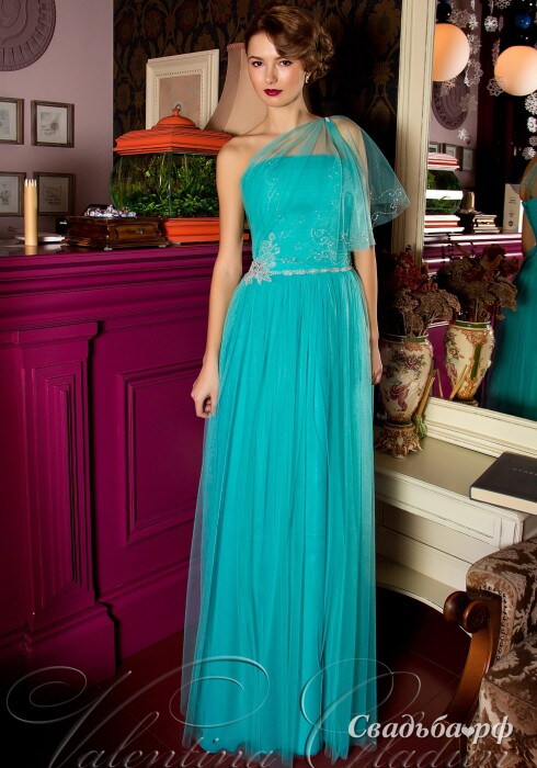 Элегантное вечернее платье из фатина представлено именитым брендом Valentina Gladun. Изящный пояс вручную расшит сверкающим стеклярусом. В качестве единственной бретели выступает полупрозрачная ткань драпировки. Длинная юбка свободного пошива струится до самого пола и придаёт образу воздушность и особый шик. Наряд для настоящей богини.