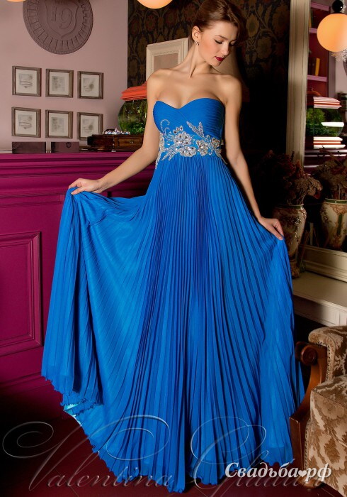 Роскошное вечернее платье от именитого бренда Valentina Gladun придётся по душе даже самым требовательным модницам. Миниатюрный корсет с открытой зоной декольте акцентирует внимание на бюсте. Широкий пояс вручную расшит сверкающим стеклярусом. Длинная плиссированная юбка из лёгкого шифона придаёт образу воздушность и особый шарм.