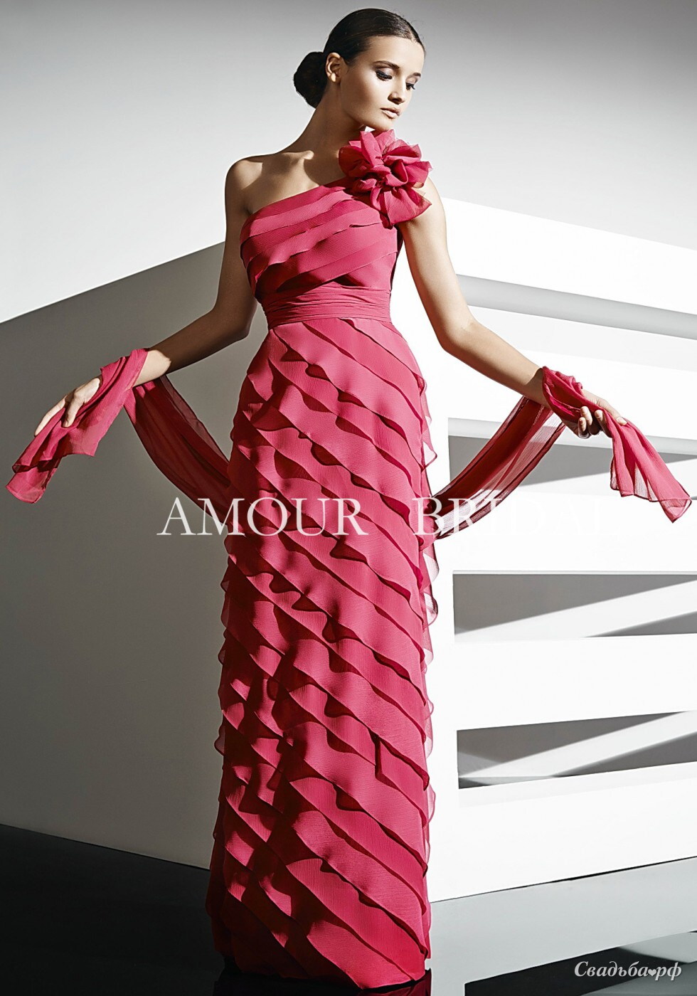 Вечернее платье выполнено из тонкого нежного шифона. Струящаяся ткань плавно ложится и подчеркивает соблазнительные изгибы тела. Особенно эффектно смотрятся пришитые по диагонали оборки. Они окутывают фигурку и делают её похожей на роскошный волшебный цветок, большой бутон которого расположен на плече. Линия талии выделена широким поясом.