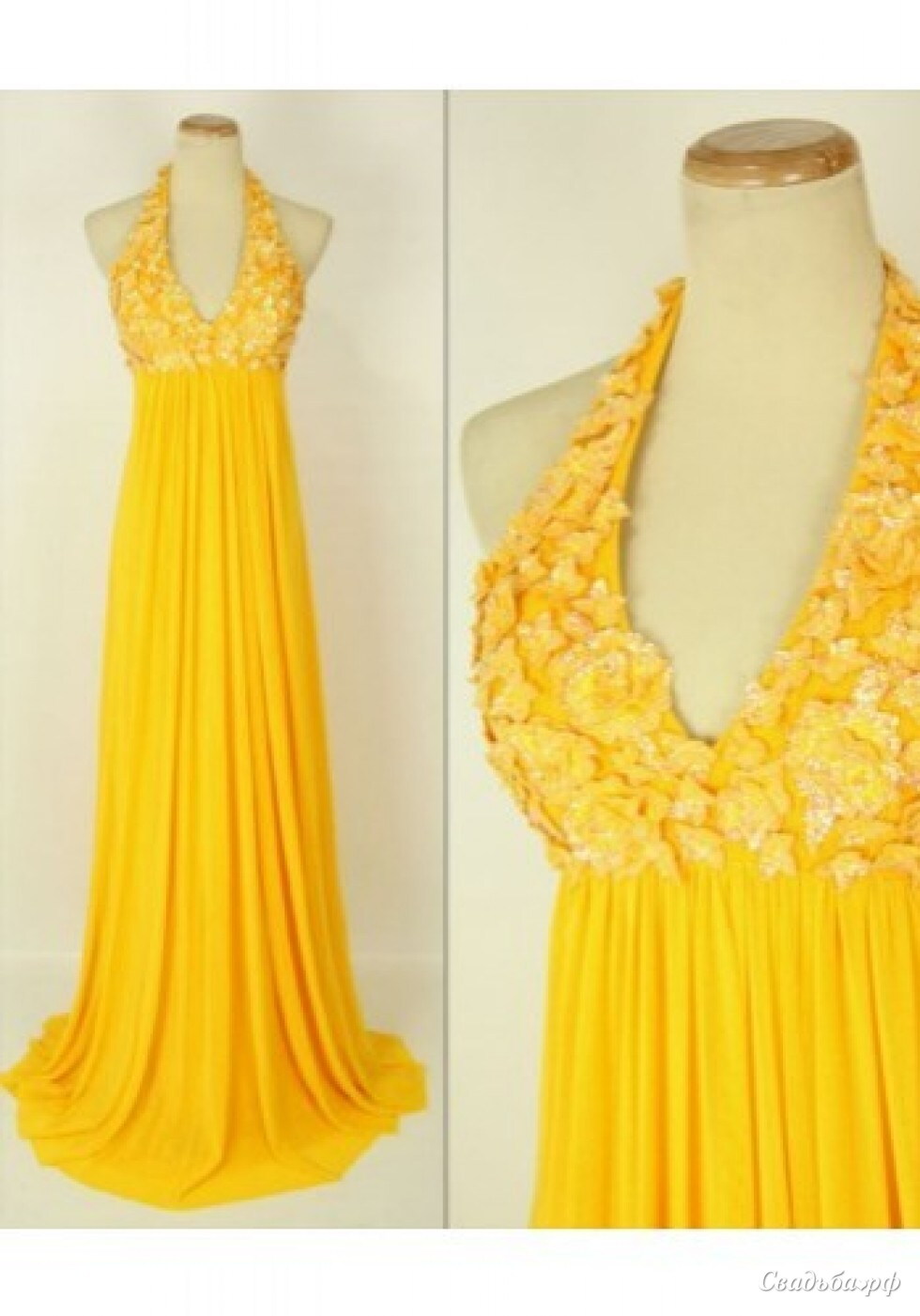 Легкое и изящное платье эффектного желтого цвета. Лиф платья украшен бабочками и цветочками расшитыми вручную пайетками.