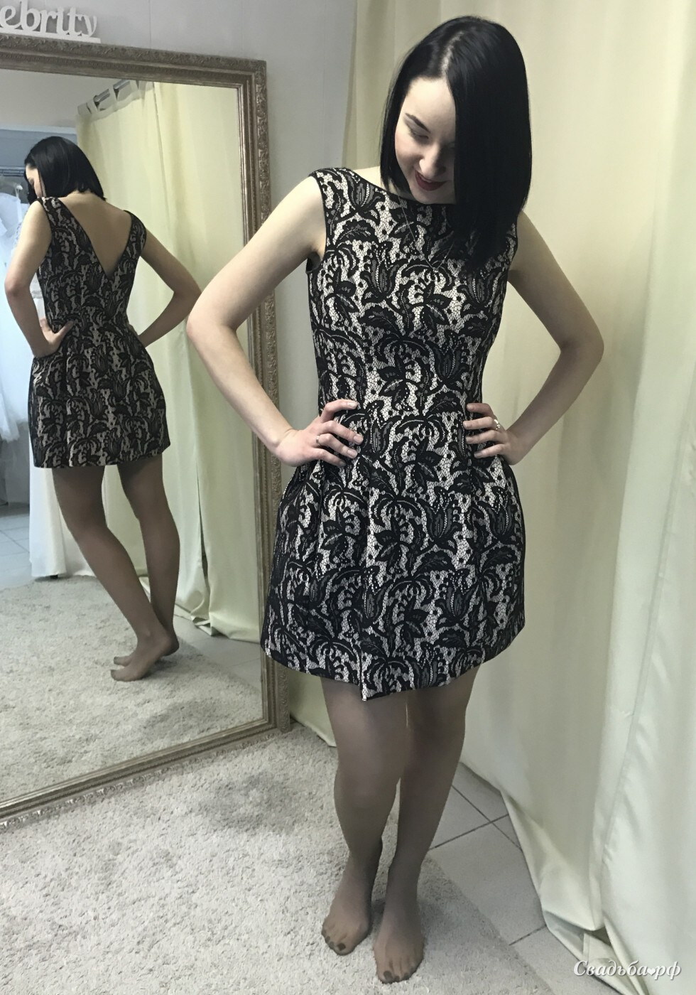 Изящное короткое платье с кружевным орнаментом. Платье имеет идеальное сочетание цветов, бежево-кремовый цвет покрывает плотное черное кружево. Платье выглядит эффектно. Хорошо садится по фигуре, держит и не теряет форму.