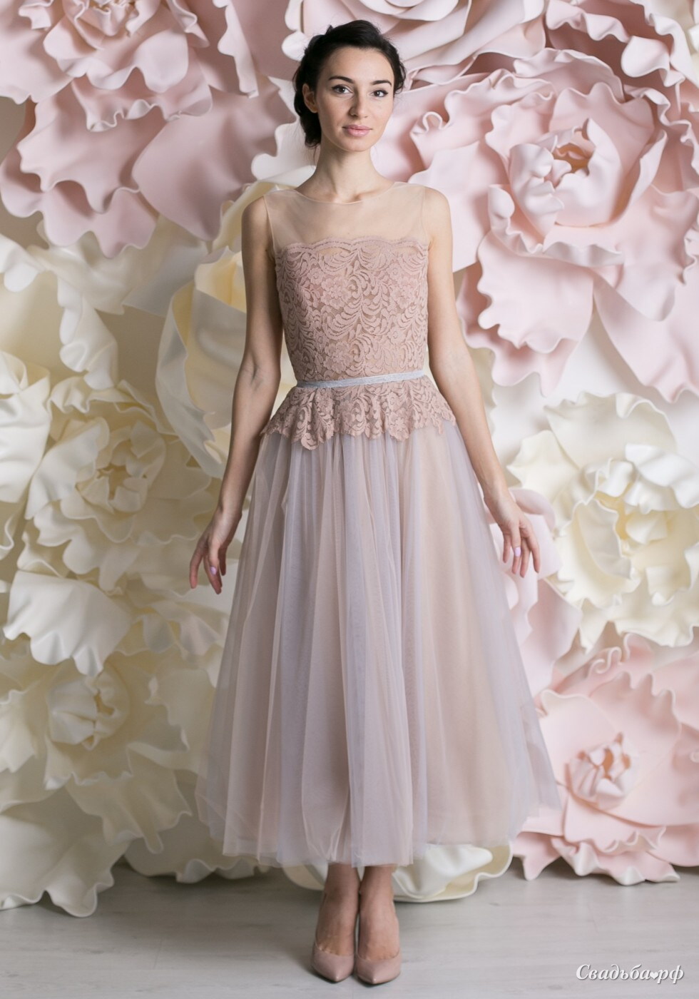Красивое платье пудрового цвета. Идеальной длины миди. Потрясающее сочетание кружева и фатина.