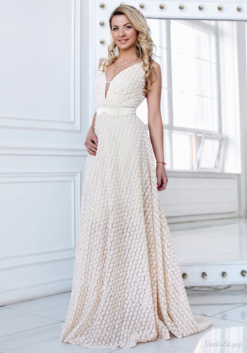 Вечернее платье легкого, струящегося кроя. Платье выполнено из необычного материала в мелкую розочку. Модель платья выглядит романтично и утонченно.