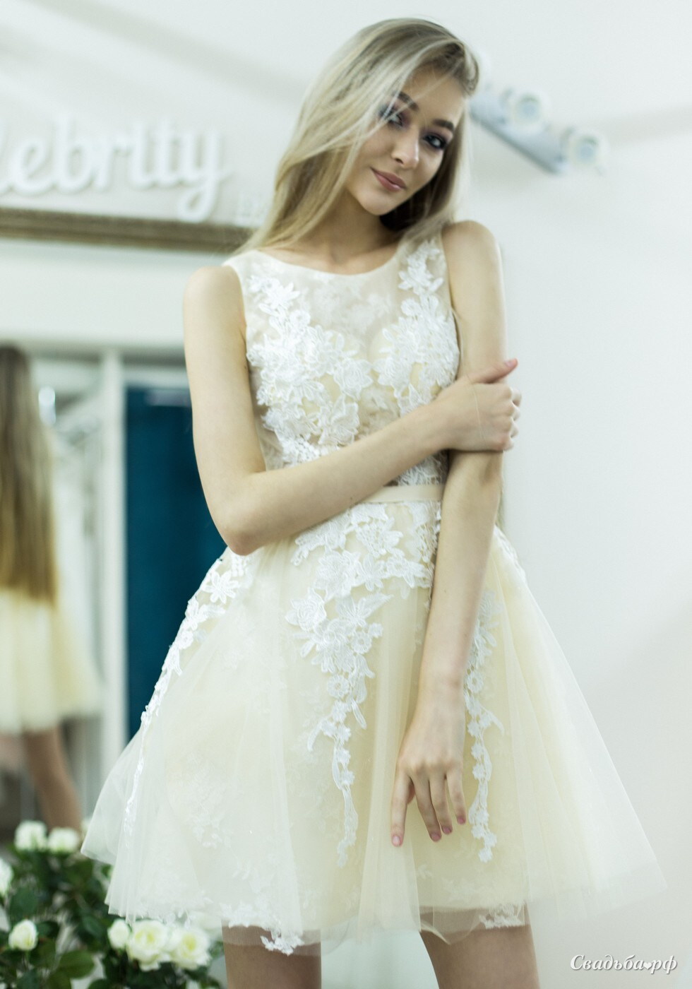 Изумительной красоты очень милое короткое платье. Кружево цвета айвори нашито поверх кремового материала. Спинка платья имеет V-форму. Платье легкое и воздушное.