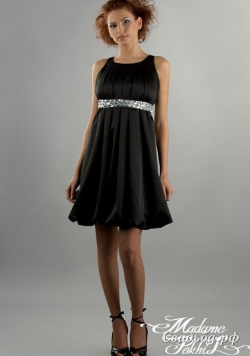 Элегантное коктейльное платье в черном цвете, прекрасно скрывающее все недостатки фигуры. Скромное декольте, две симметричные бретели, жесткий лиф, декорированный тканной сборкой, выполнен из плотного атласа. Линия груди выгодно подчеркнута поясом, расшитым пайетками, юбка крупными складками доходит до середины колена.