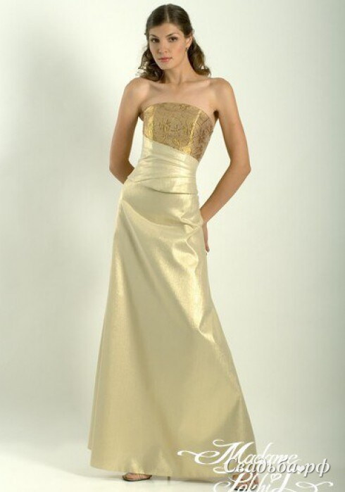 Шикарное вечернее платье классического А-силуэта с идеальной посадкой. Выполнено из натурального атласа в золотом цвете, декорированного вышивкой ручной работы. Удлиненная линия корсета, жесткий лиф и соблазнительное декольте. Линия груди изящно подчеркнута контрастом цветовой палитры и фактурой ткани, На линии талии удачно разместились утягивающие сборки.