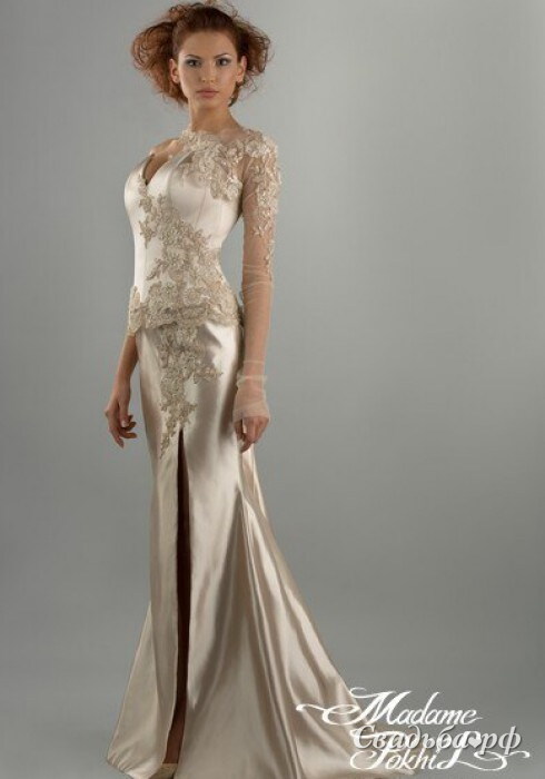 Элегантное вечернее платье с идеальной силуэтной линией. V-образный вырез прекрасно подчеркивает линию груди и придает созданному образу соблазнительность, корсет выполнен из плотного атласа и расшит изысканным кружевом и камнями. Рукава из тончайшего фатина с элементами декора в флористическом стиле. Юбка в пол с сексуальным разрезом, который начинается от линии бедер.