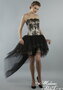 Шикарное вечернее платье оригинального покроя. Атласный корсет золотого цвета с жестким лифом без бретелей декорирован черными узорами в флористическом стиле. Пышная многослойная юбка из легкого фатина в передней части доходит до колена, а сзади имеет асимметричный рваный шлейф, придающий наряду безупречную неповторимость.