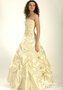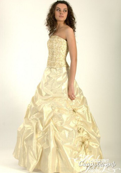 Шикарное вечернее платье классического А-силуэта в золотом цвете. Жесткий лиф без бретелей, открытые плечи, корсет расшит россыпью пайеток, завораживающих своим блеском и роскошью. Многослойная пышная юбка из атласа декорирована множеством тканных сборок, создающих иллюзию буфов. Фактурное различие исполнения корсета и юбки очень выгодно просматривается в общем свете.