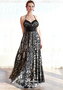 Роскошное вечернее платье классического А-силуэта. Соблазнительное декольте, одна бретель через шею, лиф декорирован по кромке изысканным кружевом. Линию талии удачно подчеркнута широким атласным поясом черного цвета. Юбка струится в пол вертикальными воздушными складками. Оригинальность наряду придает необычный принт.