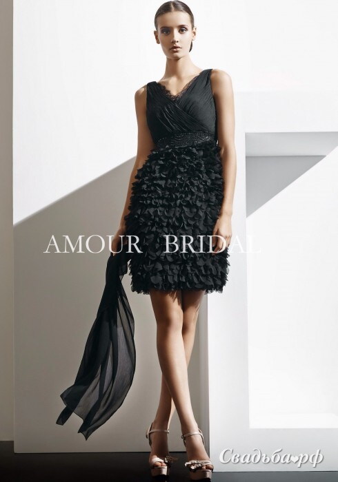 Коктейльное платье с объемной юбкой магического чёрного цвета. V-образный вырез отделан кружевной оборкой. Лиф украшен драпировкой. Декоративный пояс на линии талии расшит бисером и бусинами. Короткая прямая юбка полностью расшита маленькими лепестками из ткани, благодаря чему платье выглядит ещё более романтично и изысканно.
