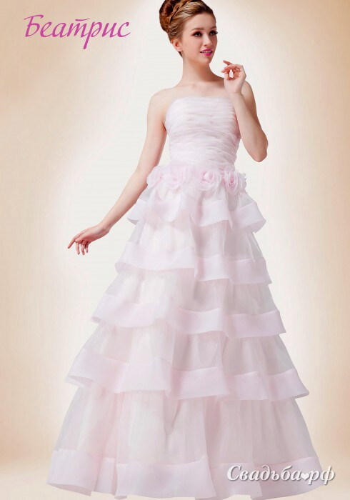 Нежное и женственное платье из органзы декорировано объёмными цветами. Корсет с открытой зоной декольте присборен вручную в соответствии с последними тенденциями моды. Наряд выгодно подчёркивает все достоинства фигуры. Длинная юбка с многоярусными воланами доходит до самого пола. Почувствуйте себя неотразимой!