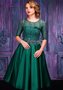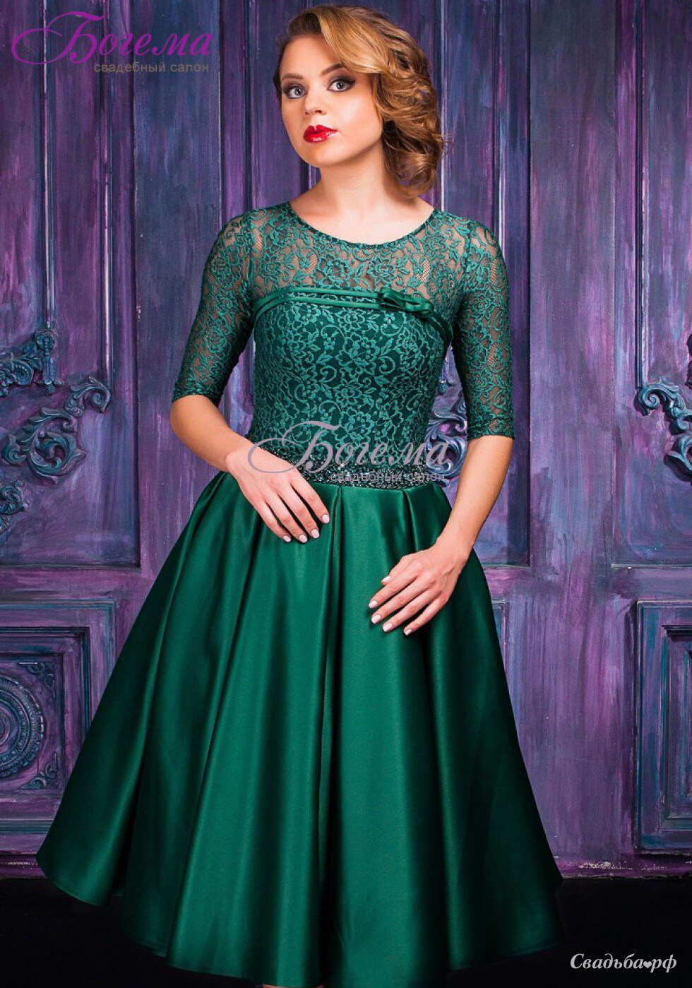 Вечернее платье с кружевным корсетом и рукавом 3/4, юбка со встречными складками до середины икры. Пояс украшен пайетками и бусинами.