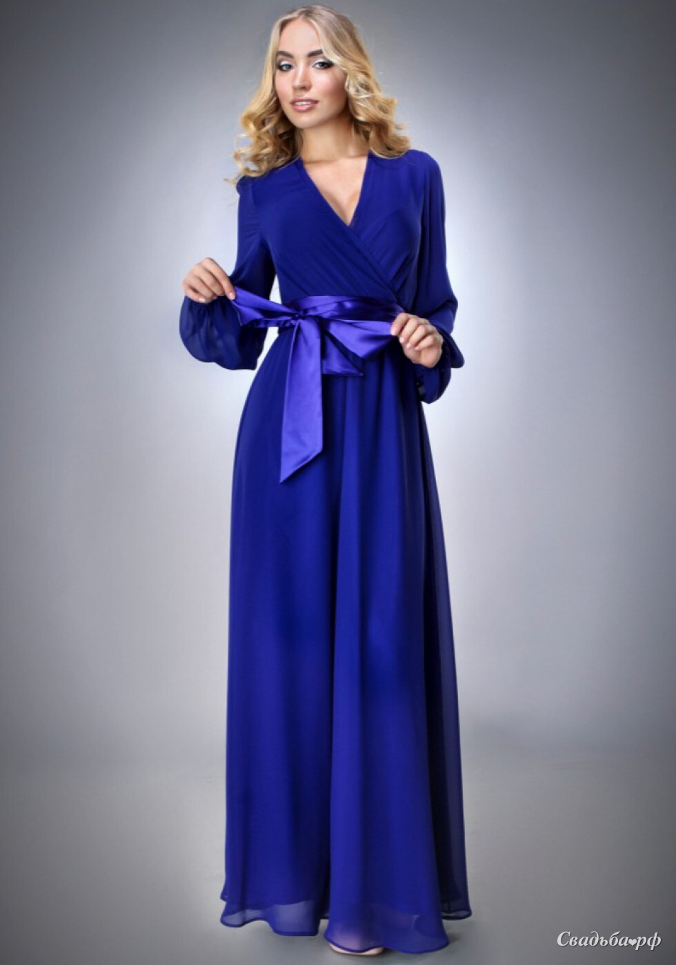 Элегантное шифоновое платье с рукавами, V-образным вырезом и атласным поясом.