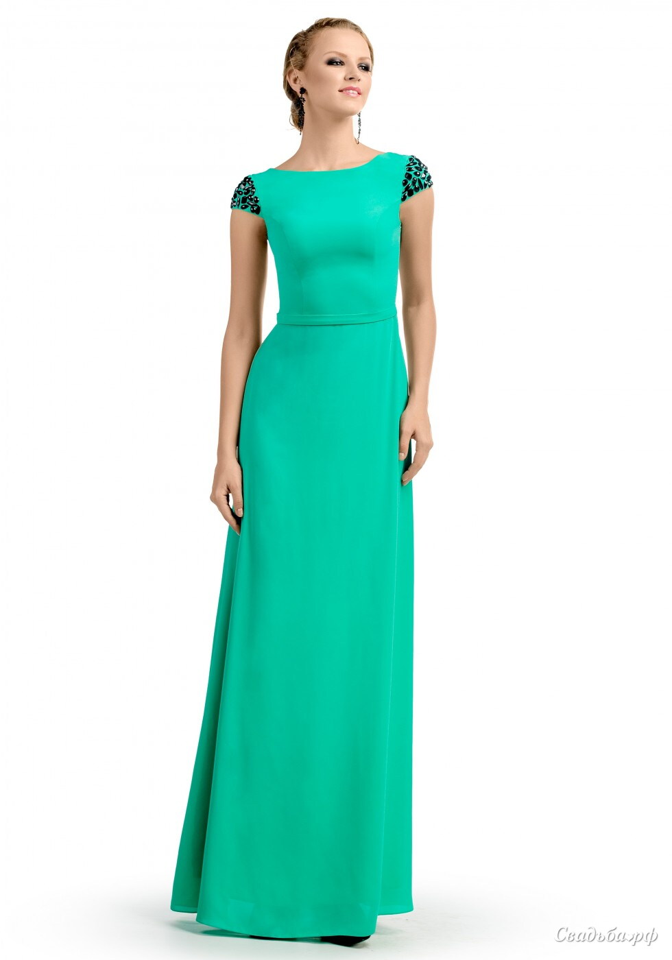 Платье прямого кроя, на плечиках и на талии расшито черными мерцающими камнями.
