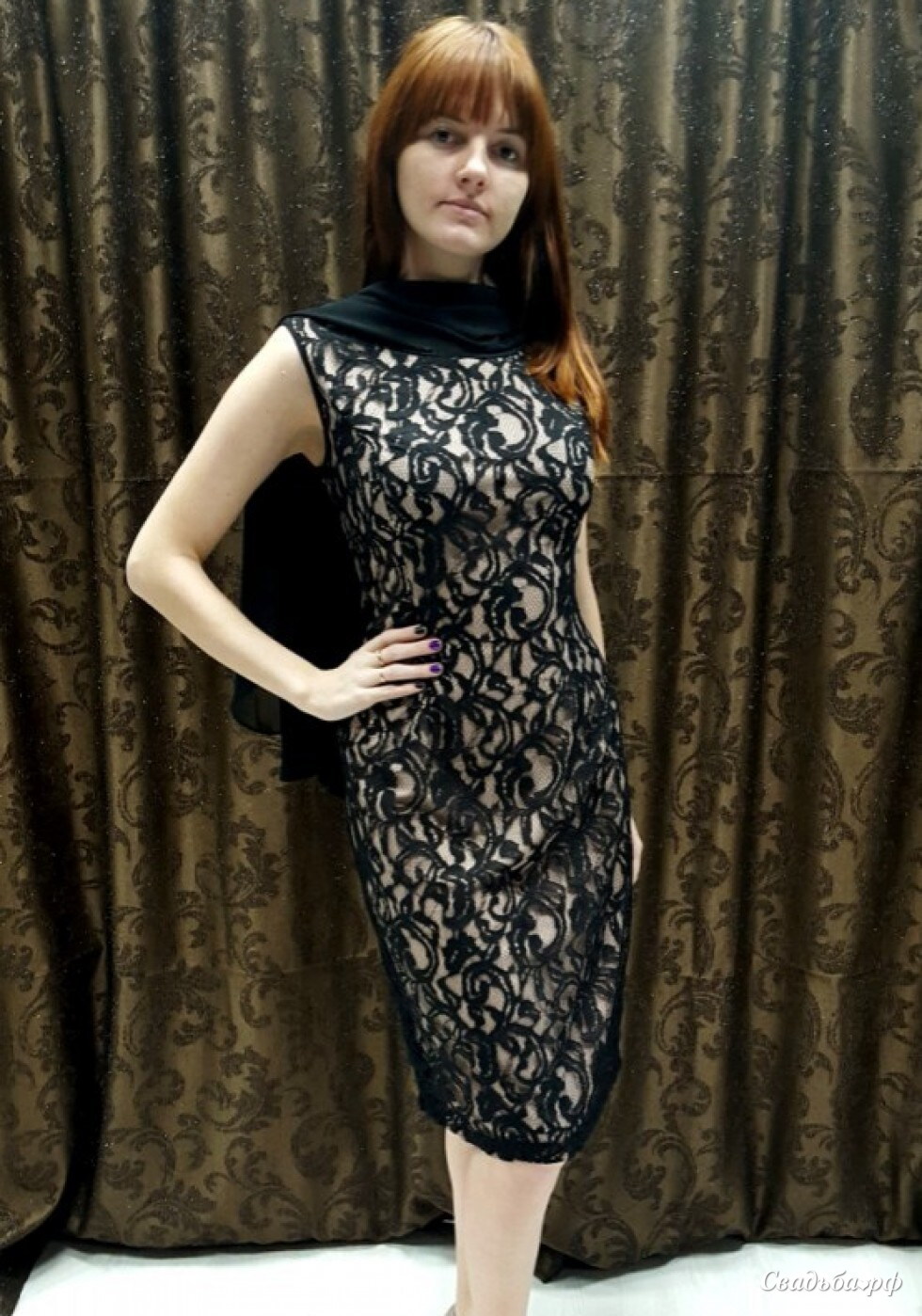 Кружевное короткое платье на бежевой основе с шифоновой пелериной.