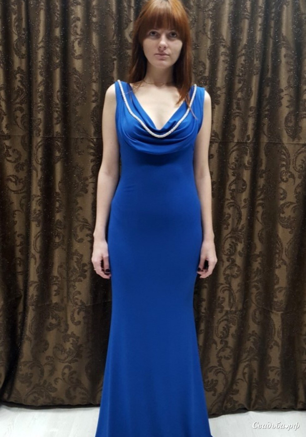 Вечернее платье спереди и сзади вырез качели, декорирован цепочкой из страз.