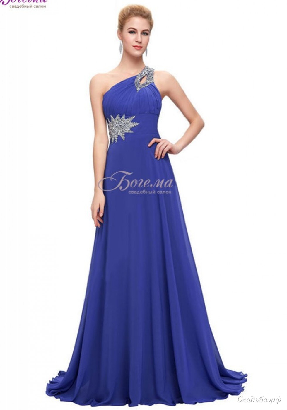 Вечернее платье в греческом стиле на одно плечо. На плече и на талии украшено стразами.