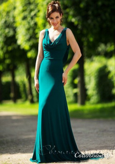 Трикотажное платье с открытой спиной. Модель выполнена из мягкой, струящейся ткани. Лиф задрапирован произвольными складами. Широкие бретели украшены изысканной вышивкой из бисера и бусин. Они соединяются на открытой спине, спускаются вдоль позвоночника и тонут в объёмной драпировке глубокого выреза. Модель представлена в красном и зелёном цветах.