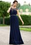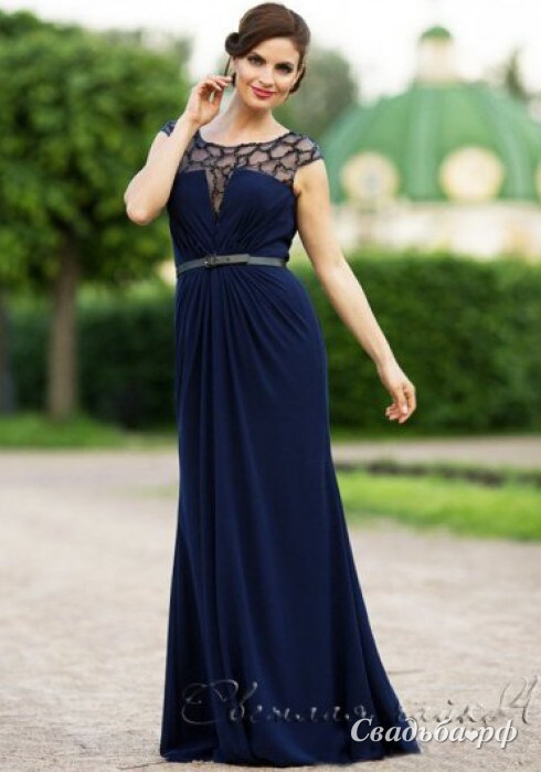Элегантное платье из трикотажа тёмно-синего цвета. Зона декольте кокетливо прикрыта полупрозрачной сетчатой тканью с оригинальной вышивкой из бисера. Линия талии выделена узким поясом с простой пряжкой. Платье свободно струится вдоль фигуры, эффектно скрывая её маленькие недостатки и подчёркивая женственность всех изгибов и линий.