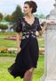 Кружевное платье с коротким рукавом таинственного чёрного цвета. Контуры V-образного выреза украшены более густыми кружевными узорами. Линия талии выделена тремя полосами ленты. Лёгкая шифоновая юбка состоит из нескольких слоёв оборок разной длины. Платье выглядит очень изысканно и утончённо, поэтому подойдёт для любого торжества.