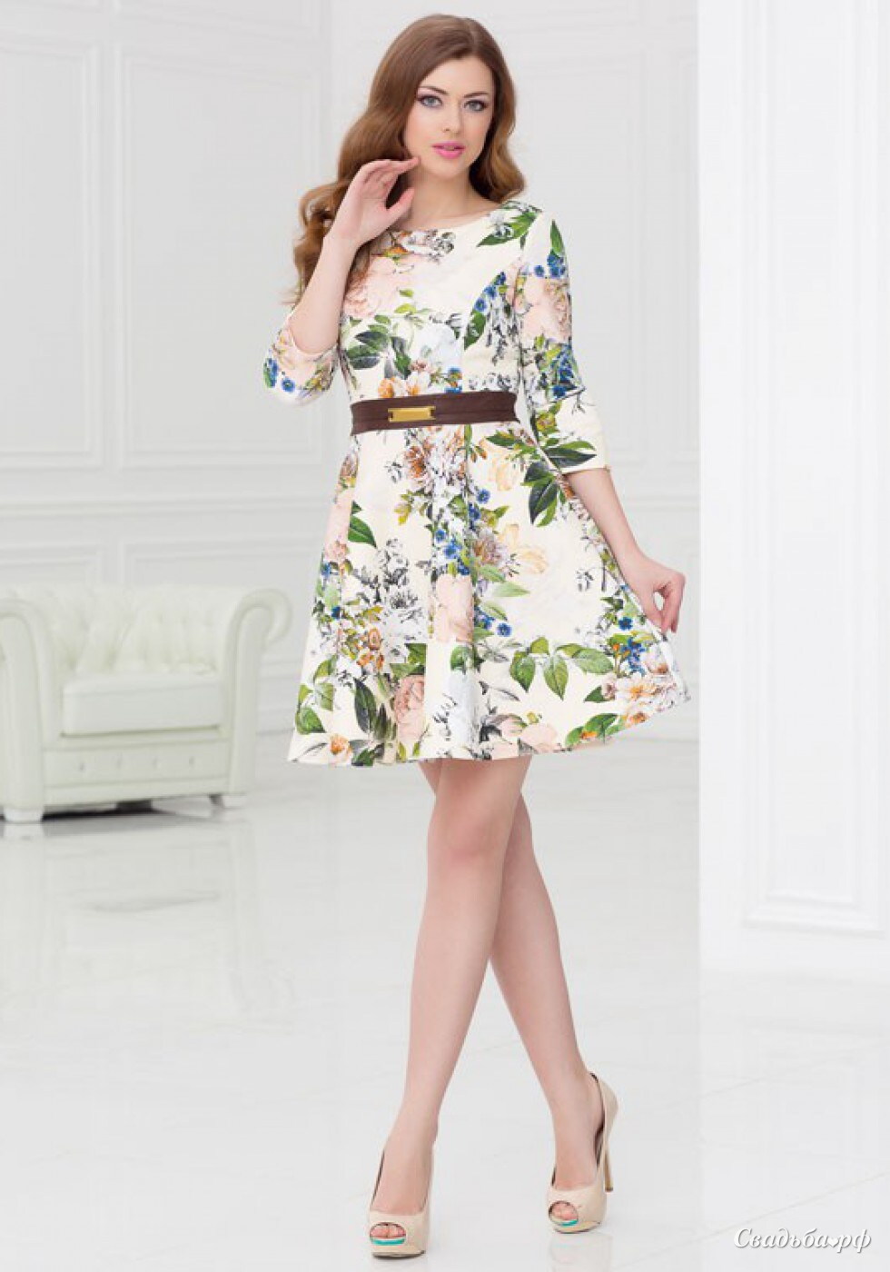 Вечернее короткое платье в молочном цвете с цветочным принтом.