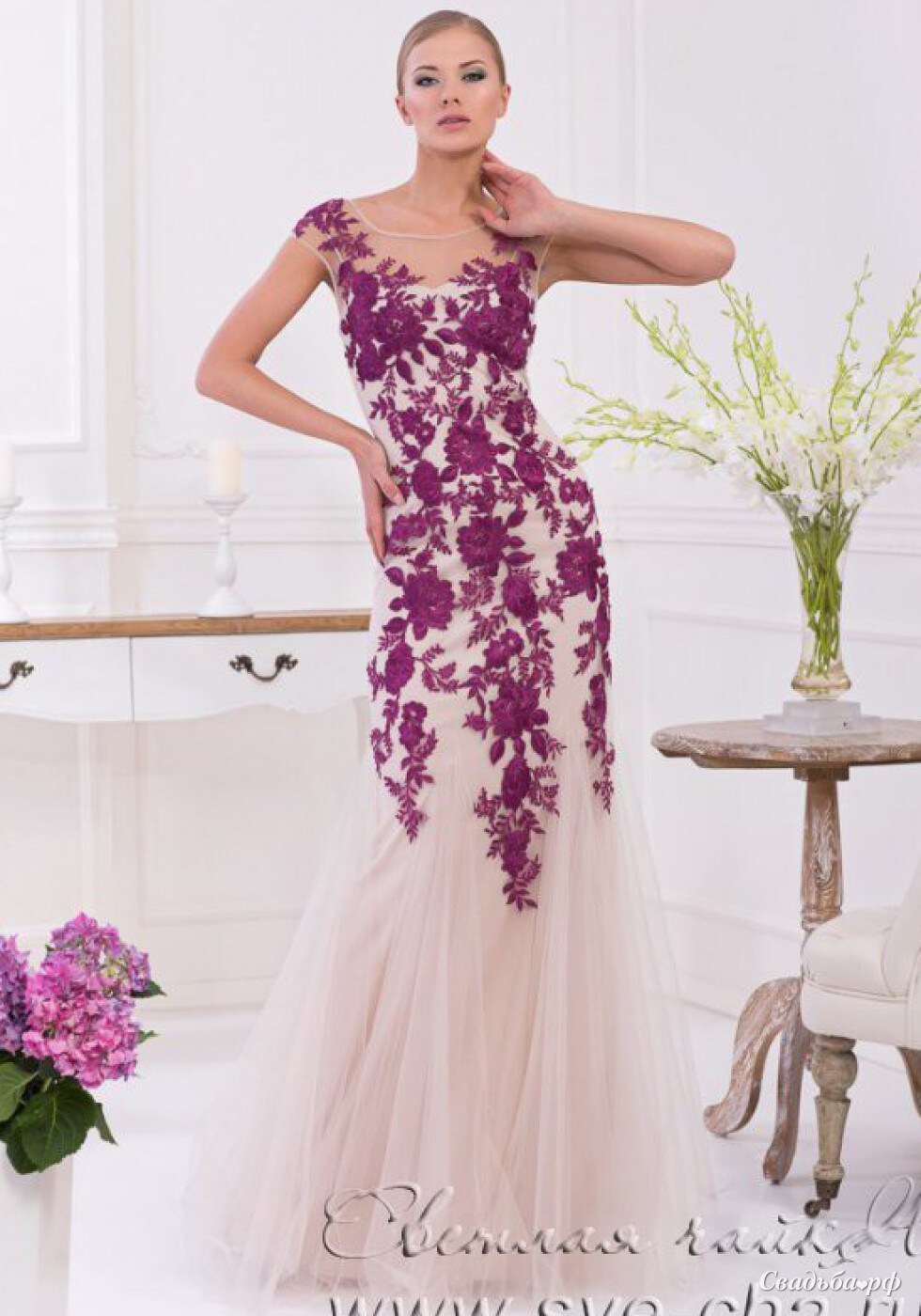 Невероятно элегантное роскошное вечернее платье, которое завоевало сердца многих девушек. Платье из стрейчевой ткани, которое абсолютно не мнется и очень комфортно к телу. Подкладка - основа из телесного нежного трикотажного стрейча. Верхний слой платья выполнен из мягкой вуали украшенной аппликацией - вышивкой в виде цветов, которая добавляет оригинальности и шика в образ. Верх сделан в виде маечки, которая прекрасно подчеркивает женственность плеч и шеи за счет выреза лодочкой. Это вечернее платье «рыбка» идеально подчеркивает силуэт, утончая его и вытягивая.
