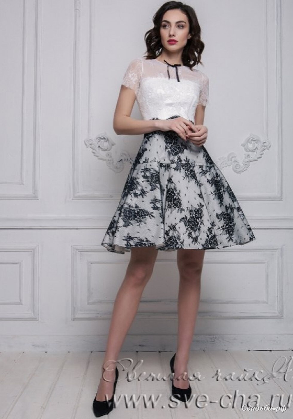 Короткое вечернее платье с пышной юбкой в черно-белом цвете.