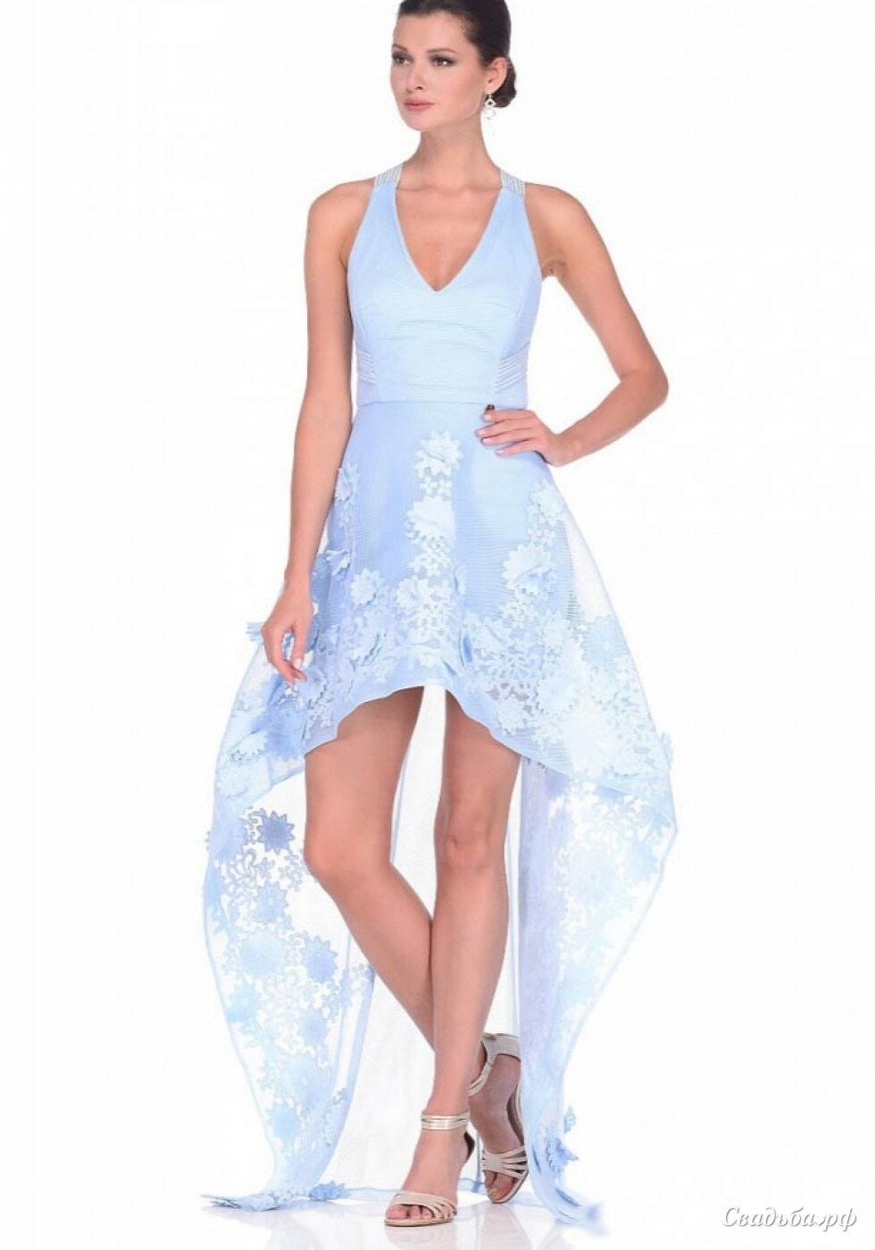 Очаровательное платье силуэта "маллет" - короткое со шлейфом. Юбка декорирована объемными цветами.