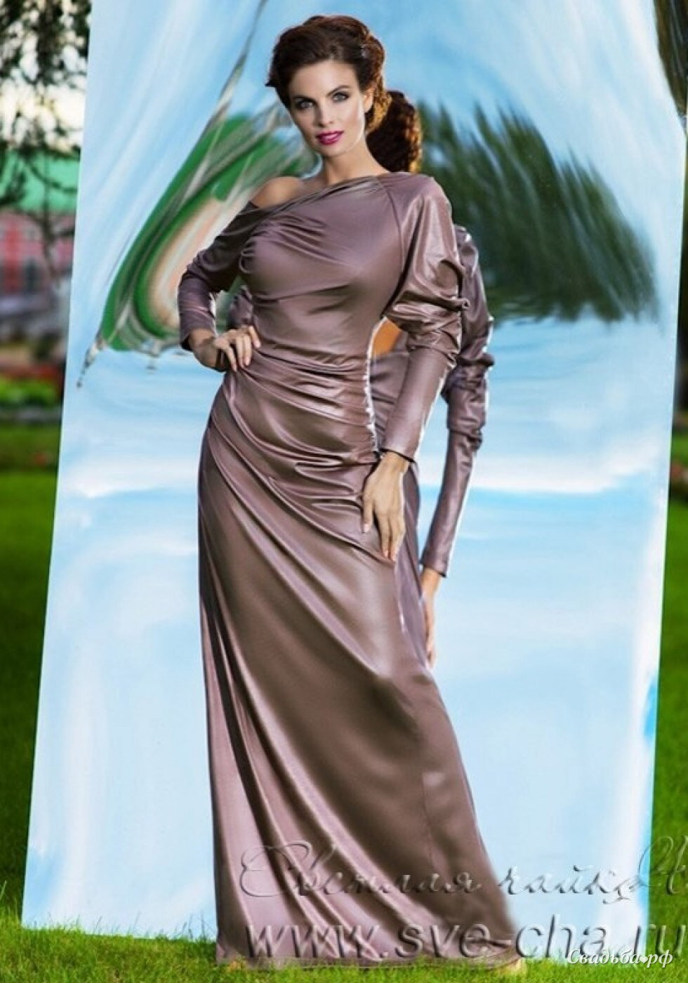 Отличный наряд на прием или торжество – экстравагантное вечернее платье из мягкого обливного холодного трикотажа. Вырез косой, на одно плечо, оголяя его девушка становится нежной и женственной. Рукава длинные, книзу на трикотажной резинке, благодаря этому в районе локтя образуется сборка, которая помогает визуально уменьшить руки. Платье облегает по талии, делая силуэт стройнее и вытягивая его. Это длинное вечернее платье с открытой спиной и небольшой драпировкой по спине идеально смотрится на любой фигуре.