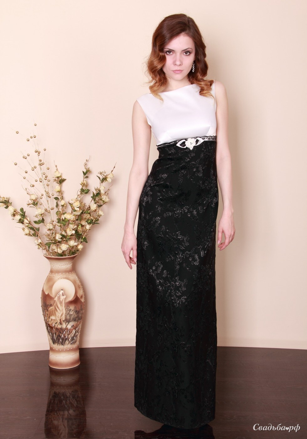 Длинное классическое платье в динамичном доминировании двух цветов-"Королей" - чёрном и белом! Главным украшением платья является мерцающая выработка на завышенной юбке и элегантный декоративный цветок на кружевном узком кантике на талии.