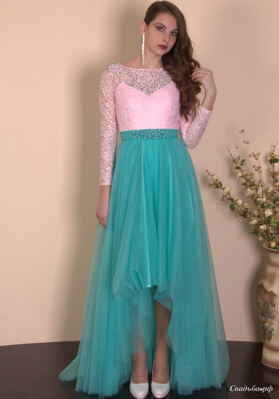 Платье А-силуэта из нежнейшего фатина бирюзового цвета и тончайшего гипюра нежно-розового оттенка, выполненное в стиле маллет. Элегантность и стиль платью придает удлиненный рукав, плавно перетекающий в декольте, расшитое зелеными бусинами. Также неотъемлемой деталью к платью идет пояс, расшитый по центру бисером и жемчугом.