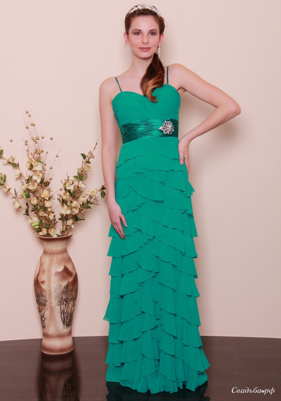Платье с очень изысканными складками на юбке и декоративной брошью на лифе. Глубокий зеленый цвет довершит этот романтичный образ.