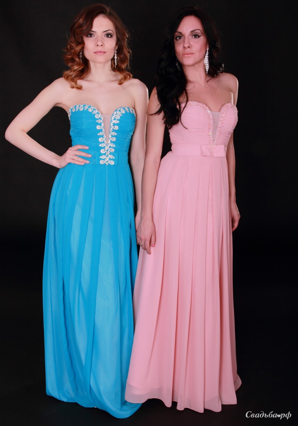 Бренд: Elena Solodkova. Длинные классические платья подчёркивающие узкую талию и роскошную грудь. Элегантность юбке придают равномерные шифоновые закладки, вытекающие от талии к подолу, превращаясь в крупные фалды водопада. И, конечно же, глубокий вырез на лифе, соединённый тонкой прозрачной сеточкой и расшитый (в первом платье) стразовой дорожкой и (во втором) крупными бусинами и бисером, плавно переходит в прямоугольный бант.